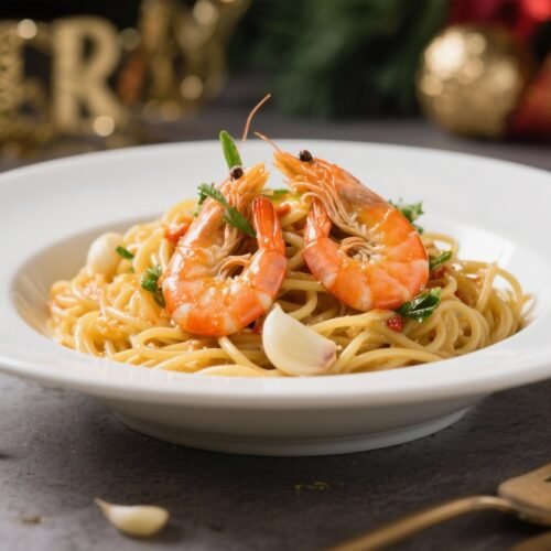 Final dish top view: New Year’s Eve garlic shrimp pasta plated restaurant-style—linguine twirled